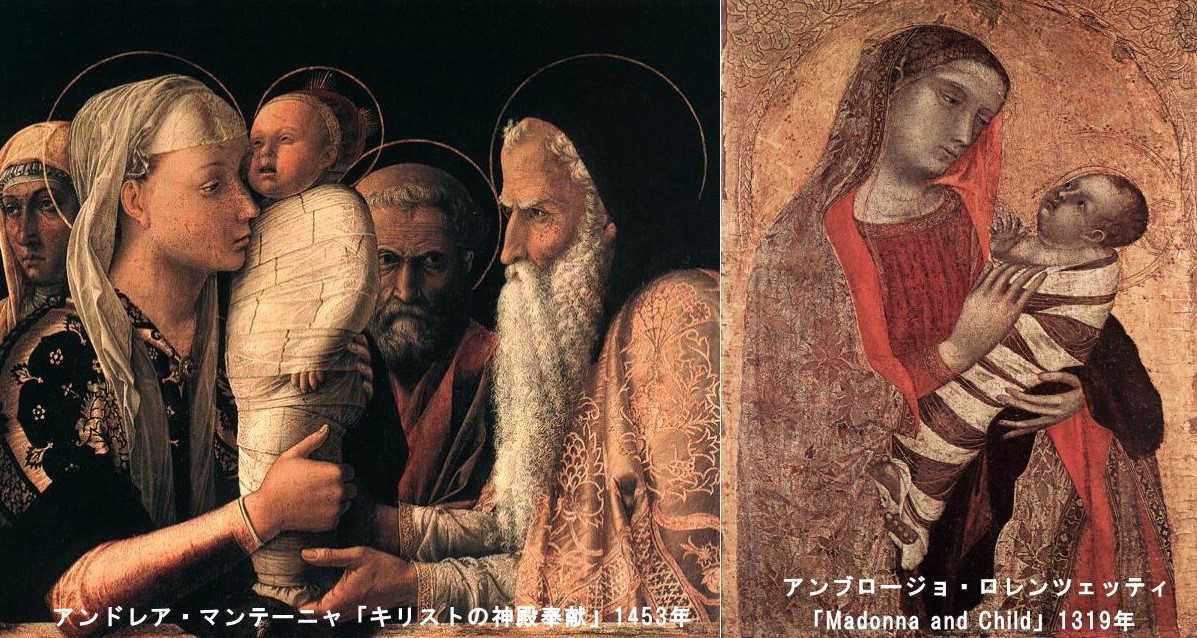 イタリア方式のきつめに巻かれた『おくるみ』が、絵画や書籍に多く残っていたため、それはミイラやミノムシのようなイメージであるが、他のヨーロッパ諸国ではもう少し緩(ゆる)めに巻かれていたようである。